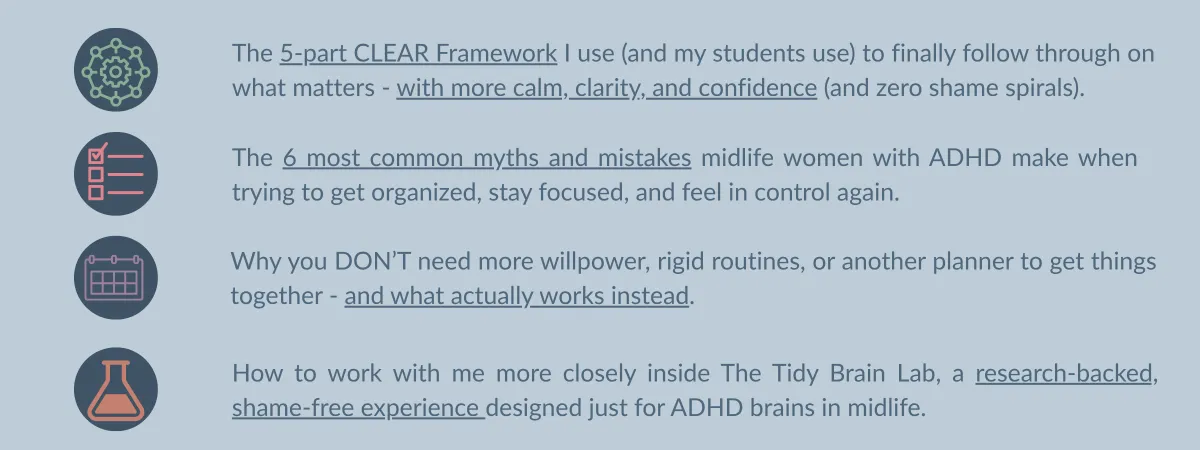 I’d highly recommend The Tidy Brain Lab to any woman feeling overwhelmed by the intersection of ADHD and menopause. It’s practical, science-backed, and filled with grace." -- Sarah P.